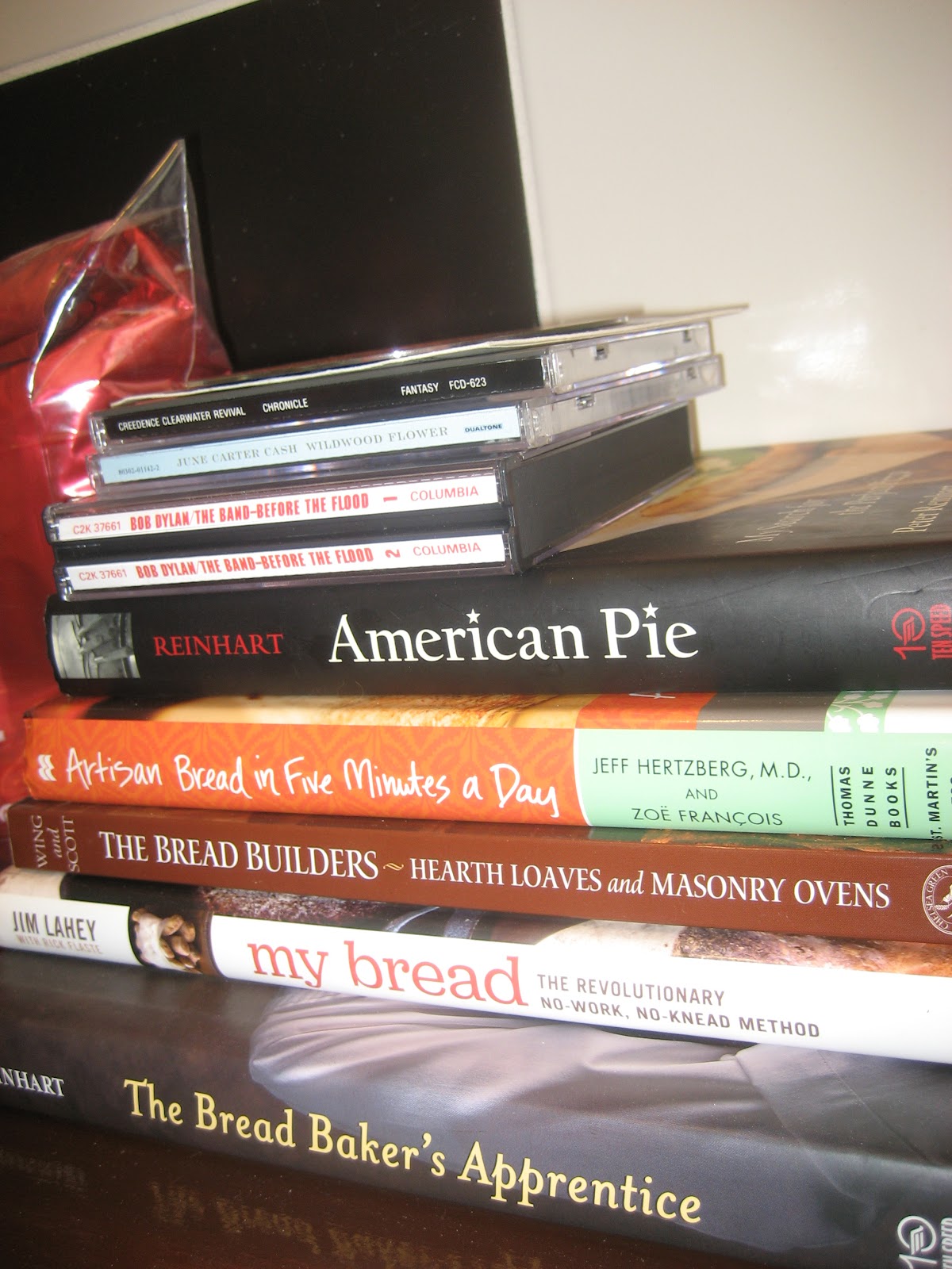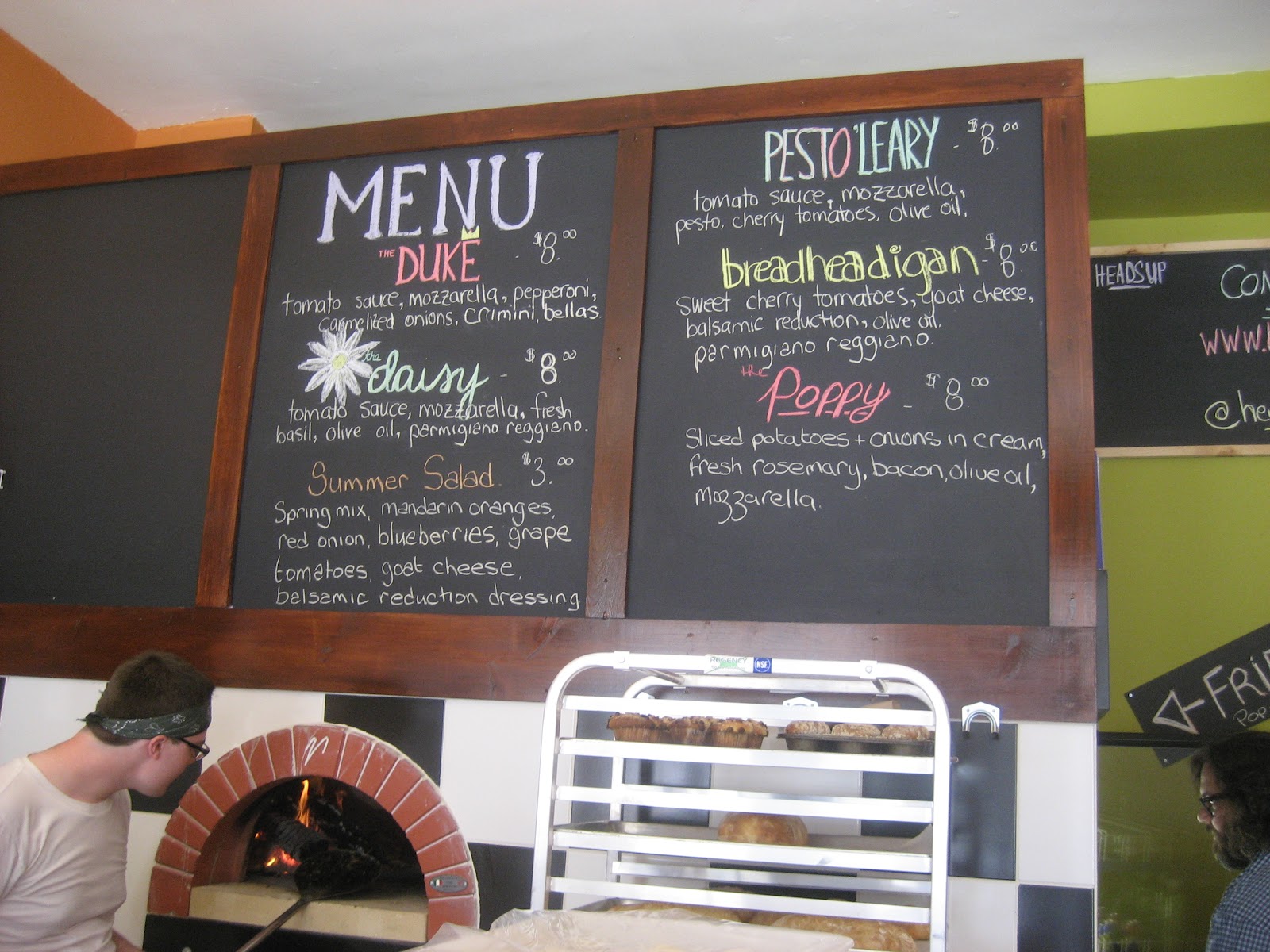 Pizzas are assembled and cooked to order; K omitted the caramelized onions from his Duke (mozza, cremini & baby bella mushrooms, & pepperoni on tomato sauce) and I nodded gleefully when the cashier/prep chef asked if I’d like extra balsamic on my Breadheadigan (cherry tomatoes, goat cheese, & parmesan with a balsamic reduction & olive oil base.) The summer salad looked tempting: mandarins, blueberries, and goat cheese in spring mix? Yum. Next time, I’ll ask about the breads and muffins on the tray below the menu, too. The muffins intrigued, but I was too focused on pizza – and watching the flames dance in the wood-fired oven while trying not to boil, myself – to ask.
