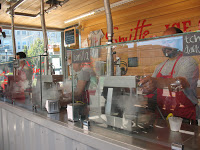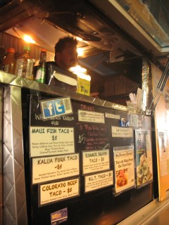 It was tough to choose what to order, so Mike waited in line at The Chairman for steamed and baked bao, and I headed over to The Taco Guys‘ truck (right) for a summer squash taco and a Maui fish taco. The summer squash taco and the pork belly bao (Chinese baked bun) with pickled daikon were standouts – summer-bright and packed with flavours that were at once comforting and unique. …mmm, pickled daikon. We ate them too quickly to take pictures!