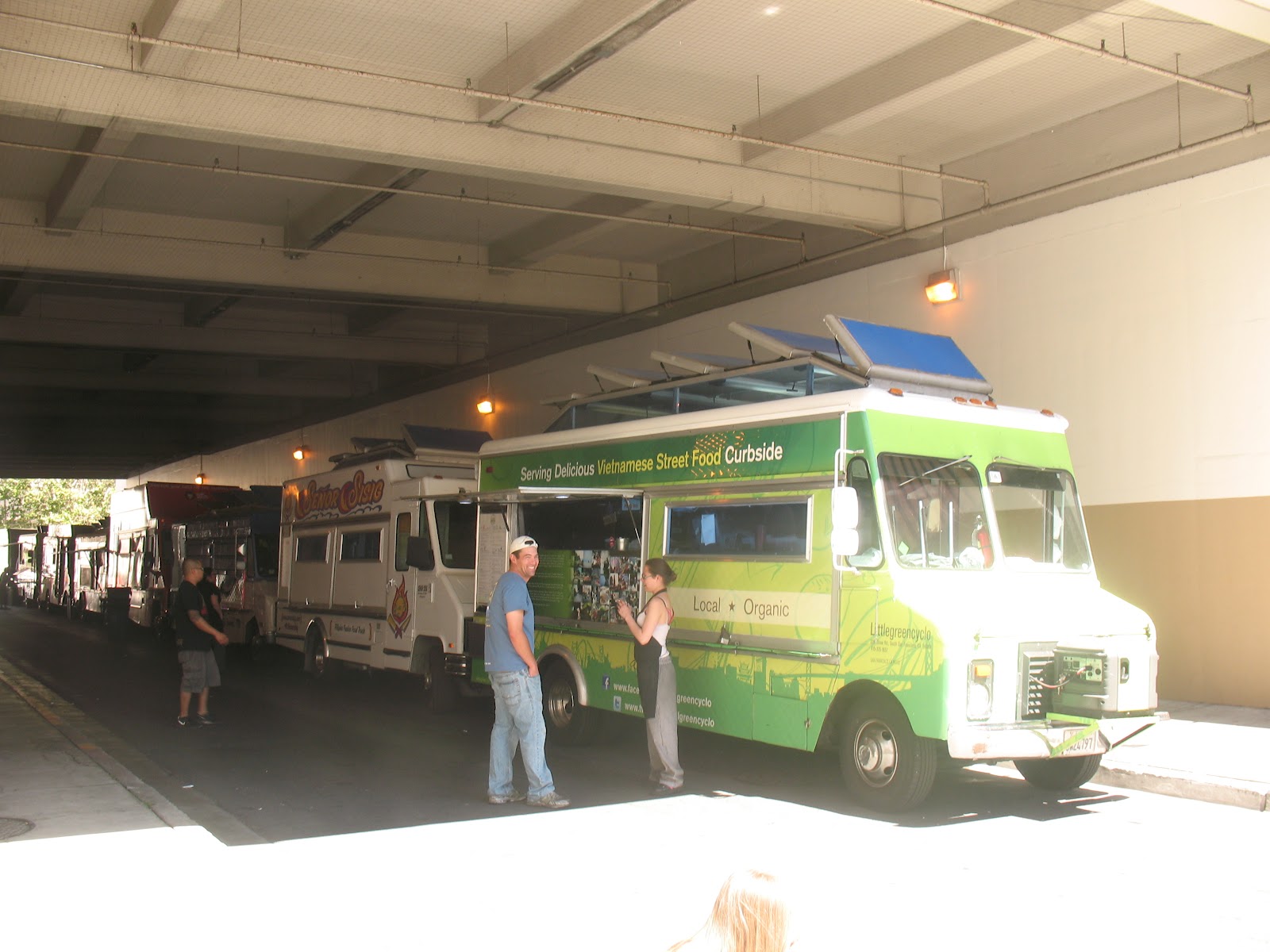 Day two, and M and I were en route to the Ferry Building’s Farmer’s Market… until, as we chilled out on a streetcar (we’d figured we’d take the scenic route) a bright green truck in the Financial District caught our eye.