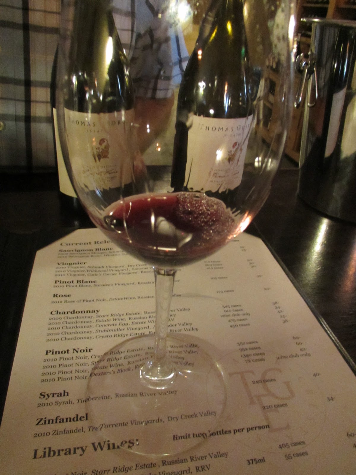 Here’s the last sip of the last wine we tried at Thomas George Estates: a 2010 Zinfandel, which we took home with us. I enjoyed the Pinot Noirs very much, but will have to return once I’ve found employment on this side of the 49th. Handcrafted wines, while wonderful, reflect the care that goes into them in their pricetag.